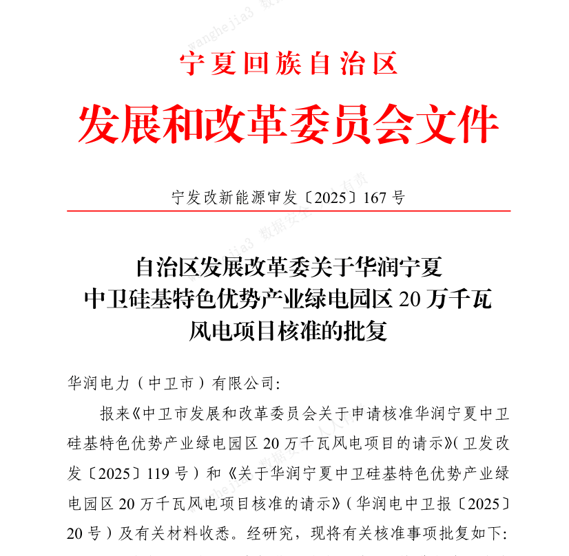 2025年9月24日,華潤電力寧夏公司順利取得華潤寧夏中衛硅基特色優勢產業綠電園區20萬千瓦風電項目核準批復。