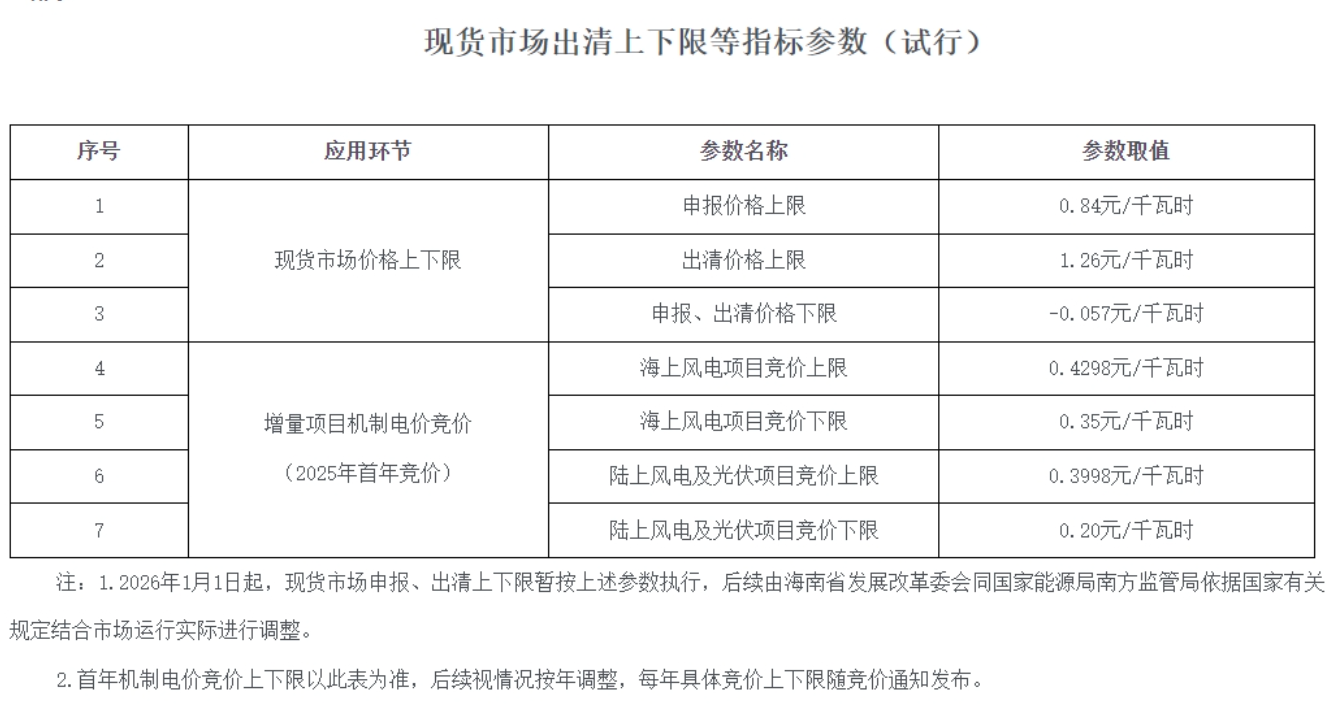 9月26日,海南省發展和改革委員會發布關于印發《海南省深化新能源上網電價市場化改革實施方案》的通知,文件提到,2026年1月1日起,全省新能源(所有風電、太陽能發電,下同)項目上網電量全部進入電力市場,上網電價通過市場交易形成。新能源項目參與市場交易的方式按照南方區域電力市場交易規則執行,鼓勵具備條件的分布式、分散式新能源聚合后報量報價參與市場交易,未報量報價參與市場的默認接受市場形成的價格。后續根據市場建設情況,逐步放開各類電源進入市場參與交易。