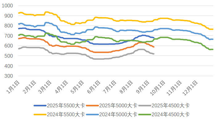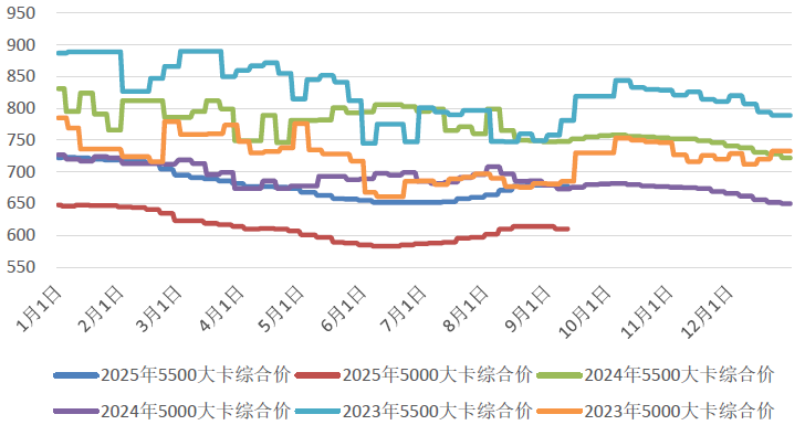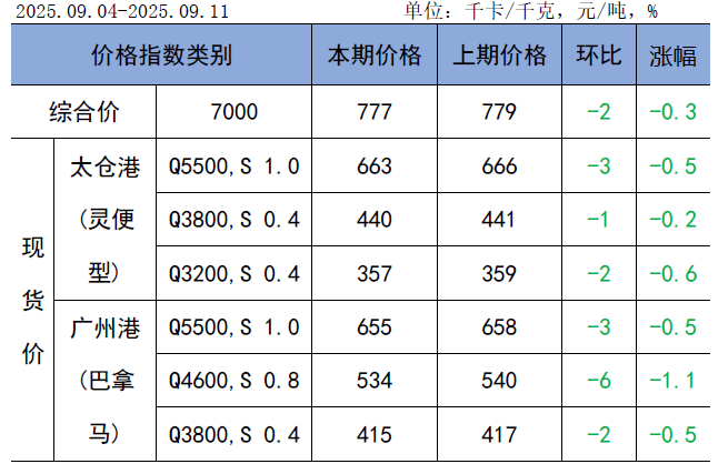 CECI進口指數777元/噸,較上期下降2元/噸,環比降幅0.3%。本期各煤種采購價格均有不同程度下降,其中太倉港(靈便型)5500千卡/千克價格環比下降3元/噸,廣州港(巴拿馬型)4600千卡/千克價格環比下降6元/噸。本周進口煤市場呈現“低卡煤止跌反彈,高卡煤承壓僵持”的特征。印尼加里曼丹礦區降雨導致裝船效率下降,部分煤礦發布不可抗力聲明,短期供應收緊疊加印度電廠雨季結束補庫需求回升,印尼礦方挺價意愿增強。從本周實際成交情況來看,進口中低卡煤實際成交價格中心環比止跌企穩,較國內煤價優勢進一步收窄,而中高卡煤仍因價格優勢不明顯維持剛需采購。月初,終端釋放少量需求,增幅有限;從實際成交來看,量、價環比均小幅上升。日前,電廠采購的貨盤交貨期集中于10月,個別貨盤至11月初。整體而言,市場預期不一,終端觀望情緒較濃。