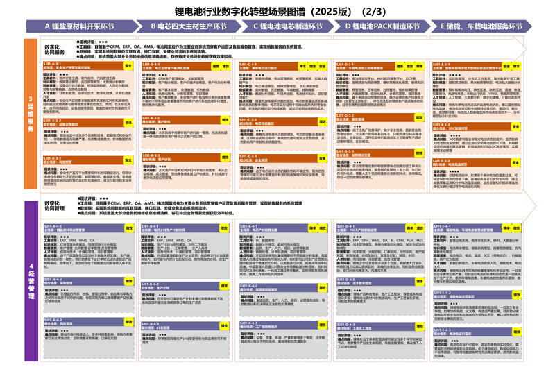 鋰電池制造過程既包含流程制造又包含離散制造(合漿到制片是流程,組裝后是離散),生產工藝復雜(既有物理反應也有化學反應),是數字化轉型流程復雜、場景豐富、帶動效應強的代表性行業。但國內鋰電池行業生產數字化水平不高,面臨管理水平落后、生產能力不均衡、動態信息不共享等問題。以“一圖四清單”推進鋰電池行業數字化轉型,可以幫助相關企業明確轉型重點、找準轉型路徑、降低轉型投入,分步實現數字化、網絡化、智能化轉型。