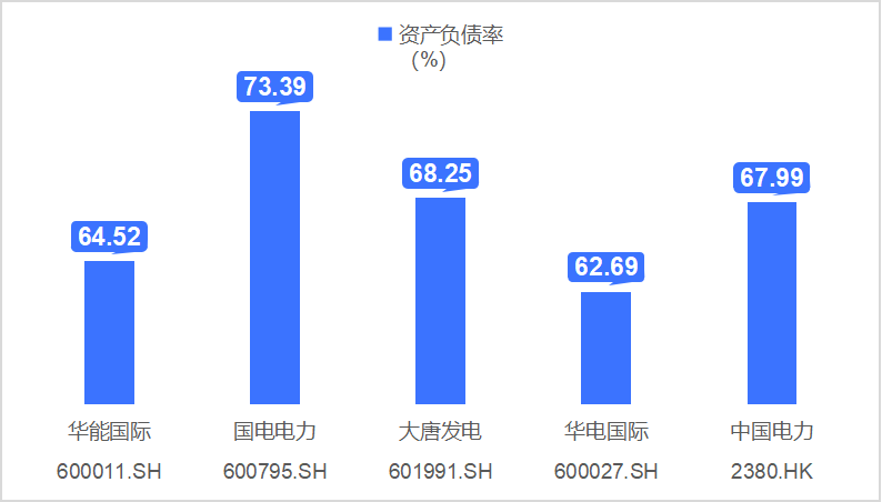 截至6月末,五大電力上市公司的資產(chǎn)負(fù)債率整體在62%~75%之間,處于行業(yè)中游偏上水平。就具體企業(yè)看,華能國際、華電國際資產(chǎn)負(fù)債率均穩(wěn)定在65%以下,符合國資委要求。