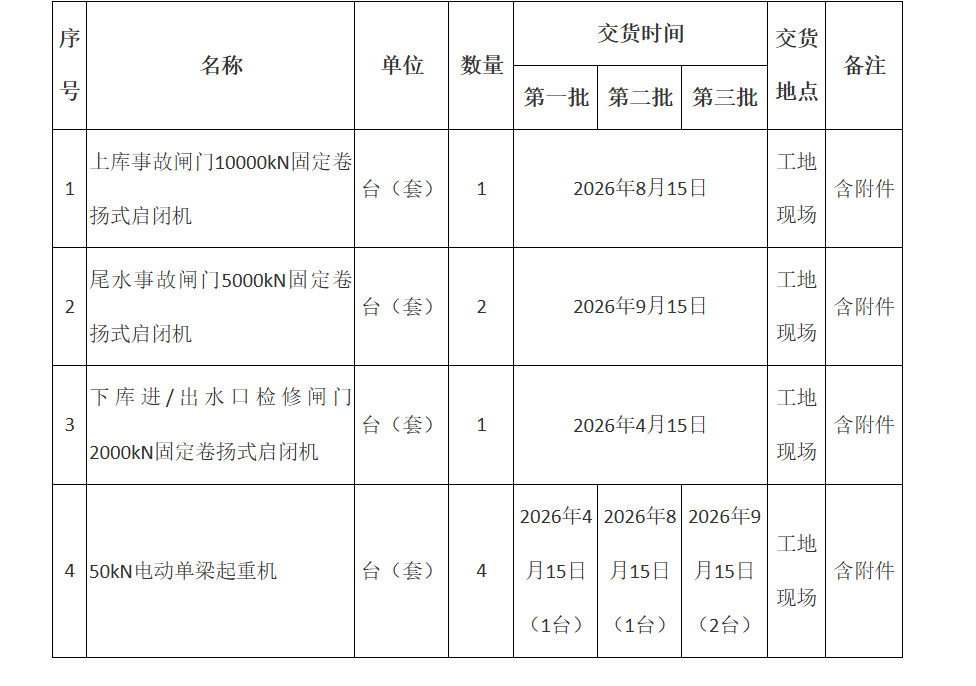 招標項目履約期限:按照烏溪江抽水蓄能電站總體計劃安排,2025年2月主體工程承包人進點,本電站于2028年7月底首臺機組投入商業(yè),至2028年9月底全部機組投入運行。交貨進度見下表:
