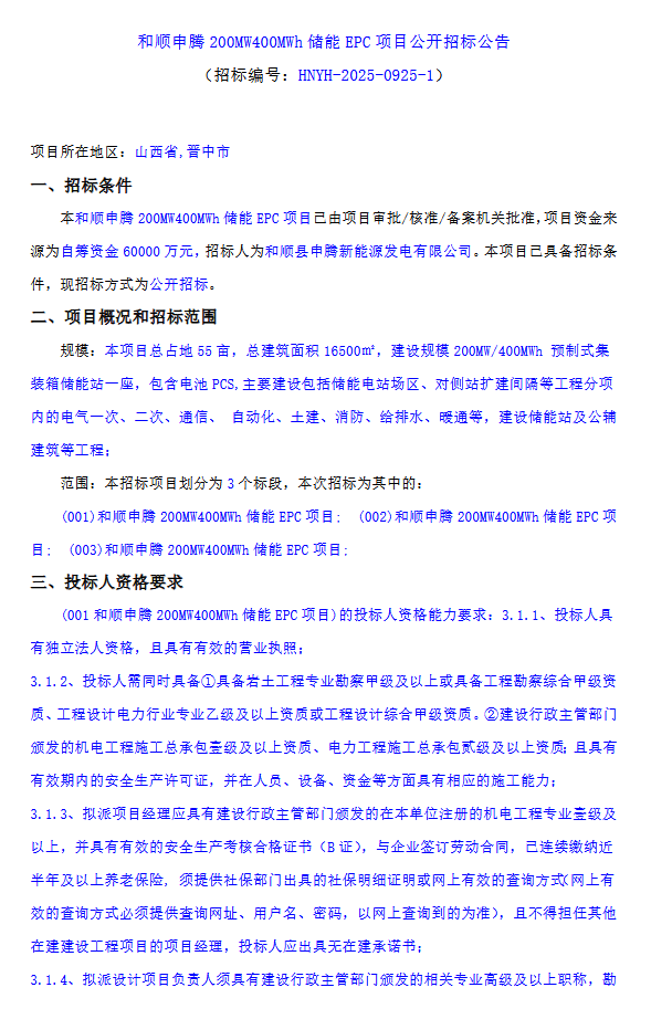 9月25日,和順縣申騰新能源發電有限公司發布和順申騰200MW/400MWh儲能EPC項目公開招標公告。項目位于山西省晉中市,項目資金來源為自籌資金60000萬元,折合單價1.5元/Wh。