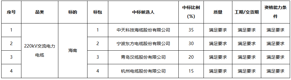 南方電網公司2025年220kV交流電力電纜新增批次框架招標項目中標候選人公示