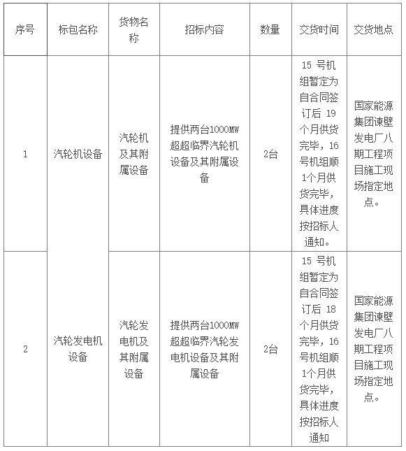 2.1.2招標范圍及標段(包)劃分:招標范圍包括兩臺1000MW汽輪發電機組(含汽輪機及發電機)及其所有附屬設備和附件。