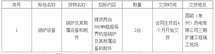 2.1 項目概況、招標范圍及標段(包)劃分:2.1.1項目概況:國能(泉州)熱電有限公司位于泉州市泉港區南埔鎮柯厝村北側。毗鄰南埔圍墾區,南側緊鄰港口鐵路專用線,西南距泉州市區約55km,  東南距肖厝港區直線距離約1.5km,西距國道G228(濱海北路段)約100m、距國道G324(福廈公路)約8km,東北臨湄洲灣海域。國能(泉州)熱電有限公司已建成一、二期2×300MW+2×670MW 燃煤機組,規劃有三期擴建場地。一期工程2×300MW兩臺機組于 2006 年 4 月建成投產;二期工程2×670MW兩臺機組分別于 2011 年 12 月和2012 年 4 月建成投產。本期工程在二期西側預留場地進行擴建,建設條件較好。本期擬利用原規劃預留場地建設三期2×660MW超超臨界燃煤發電機組,同步建設脫硫、脫硝設施。現根據項目推進情況進行國能(泉州)熱電有限公司三期(2×660MW)擴建工程汽輪發電機組及其附屬設備采購公開招標。