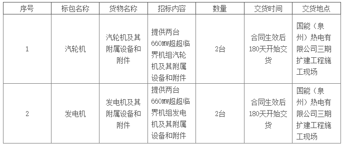 項目包括國能(泉州)熱電有限公司三期(2×660MW)擴建工程汽輪發電機組的相應設備、材料、備品備件,專用工具、技術資料以及有關的運輸、技術服務等,詳見技術要求。
