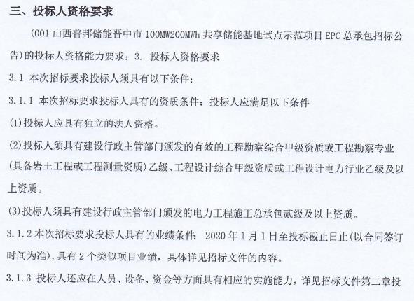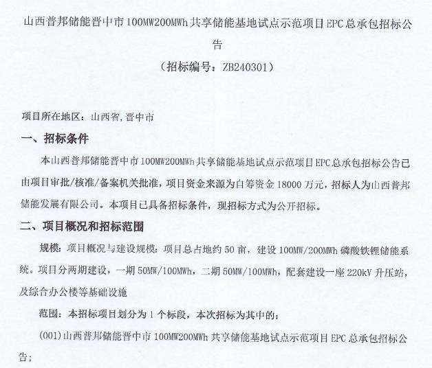 3月7日,山西普邦儲能晉中市100MW200MWh共享儲能基地試點示范項目EPC總承包招標公告發布。項目總占地約 50 畝,建設 100MW/200MWh 磷酸鐵鋰儲能系統。項目分兩期建設,一期50MW/100MWh,二期50MW/100MWh,配套建設一座220kV升壓站,及綜合辦公樓等基礎設施。