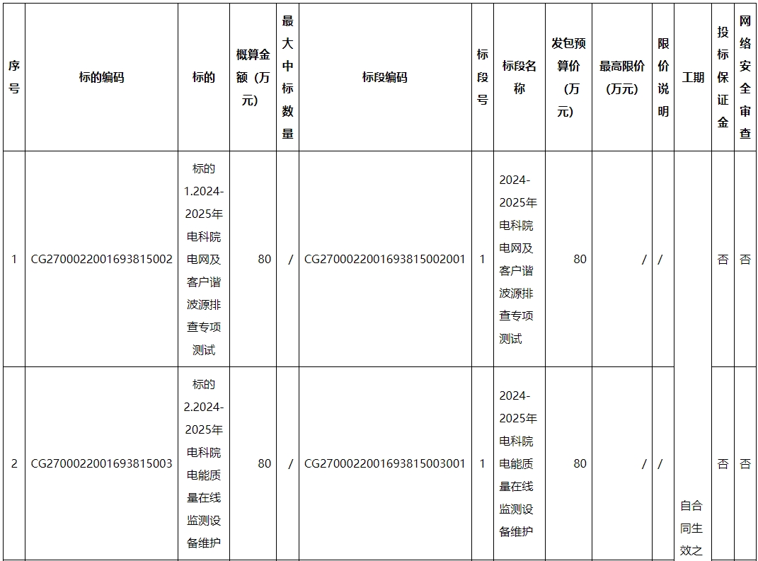 標的1. 2024-2025年電科院電網及客戶諧波源排查專項測試:對變電站、電力用戶、配電臺區、供用電設備或線路等開展電能質量諧波源排查測試,包括電壓偏差、諧波電流、諧波電壓、三相不平衡、電壓閃變和頻率等指標,并以指定形式出具測試報告、包含相應的測試結果和詳細測試數據。