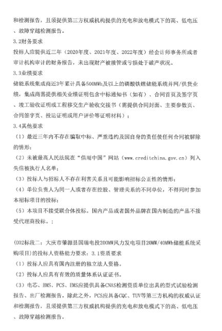 標(biāo)段二:大慶市肇源縣國瑞電投200MW風(fēng)力發(fā)電項(xiàng)目20MW/40MWh儲能系統(tǒng)采購項(xiàng)目