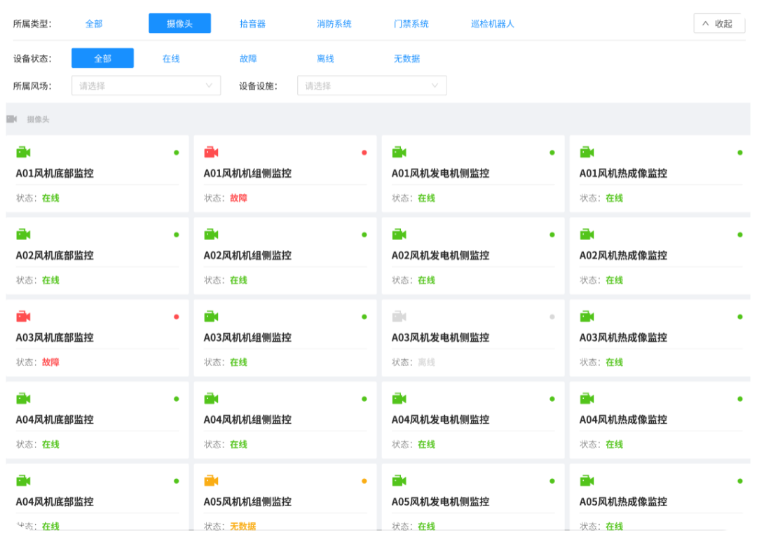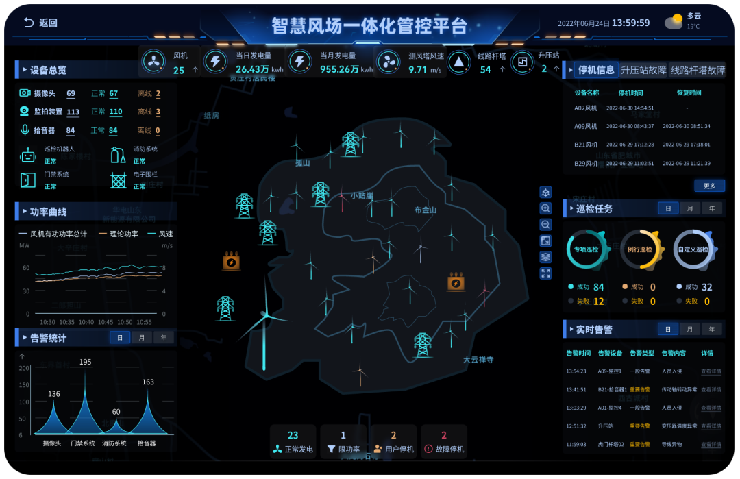 通過監控風機、升壓站、線路等場景的實時狀態信息及歷史監測數據,實現對風場的整體管控。