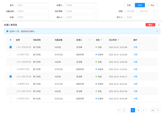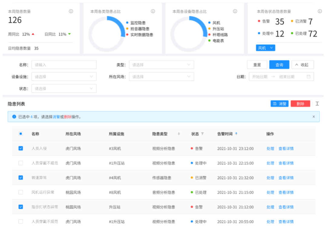 支持查看隱患從發生到消除的全流程記錄,包括隱患數據、告警狀態、處理詳情、工單查詢等信息,形成隱患處理閉環,達到監測隱患全生命周期的目的。