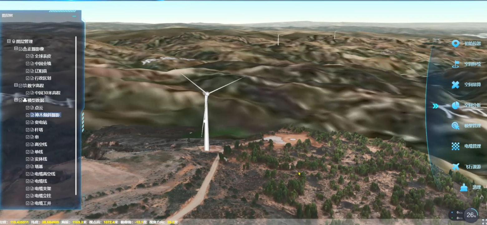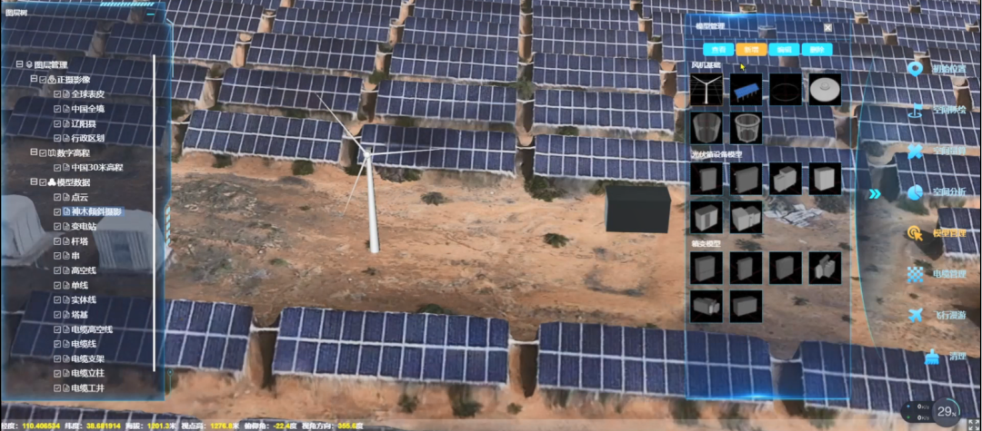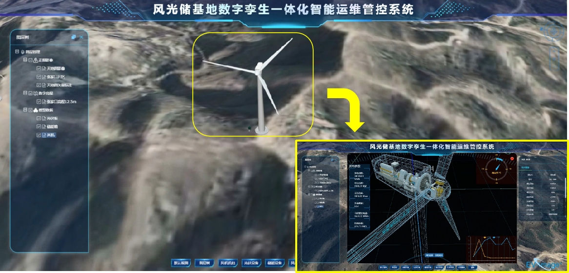 基于智采集(高效智慧遙感采集網(wǎng))、智聚合(遙感三維大數(shù)據(jù)聚合)、智應(yīng)用(遙感智慧應(yīng)用探索)于一體的智慧遙感服務(wù)體系,北京國(guó)遙新天地信息技術(shù)股份有限公司自主研發(fā)了時(shí)空遙感大數(shù)據(jù)三維平臺(tái)EV-Globe,平臺(tái)依托數(shù)字孿生技術(shù),結(jié)合虛擬游戲引擎與云渲染模式,能夠在多源地理空間信息基礎(chǔ)上,通過(guò)大數(shù)據(jù)挖掘分析,完成數(shù)字孿生平臺(tái)對(duì)風(fēng)電系統(tǒng)各空間數(shù)據(jù)的統(tǒng)一存儲(chǔ)與管理,同時(shí)提供4D數(shù)據(jù)上傳、加載等服務(wù),對(duì)風(fēng)電空間信息進(jìn)行建模、仿真、演繹和操控,開(kāi)展三維電力設(shè)施精細(xì)化展示。