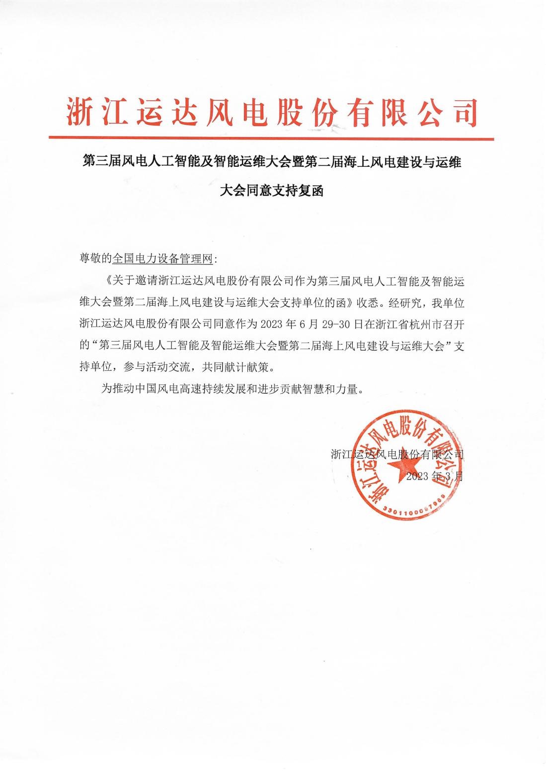 浙江運達風電股份有限公司作為支持單位出席2023年6月29-30日在杭州召開的2023年第三屆風電人工智能大會及智能運維大會暨第二屆海上風電建設與運維大會。
