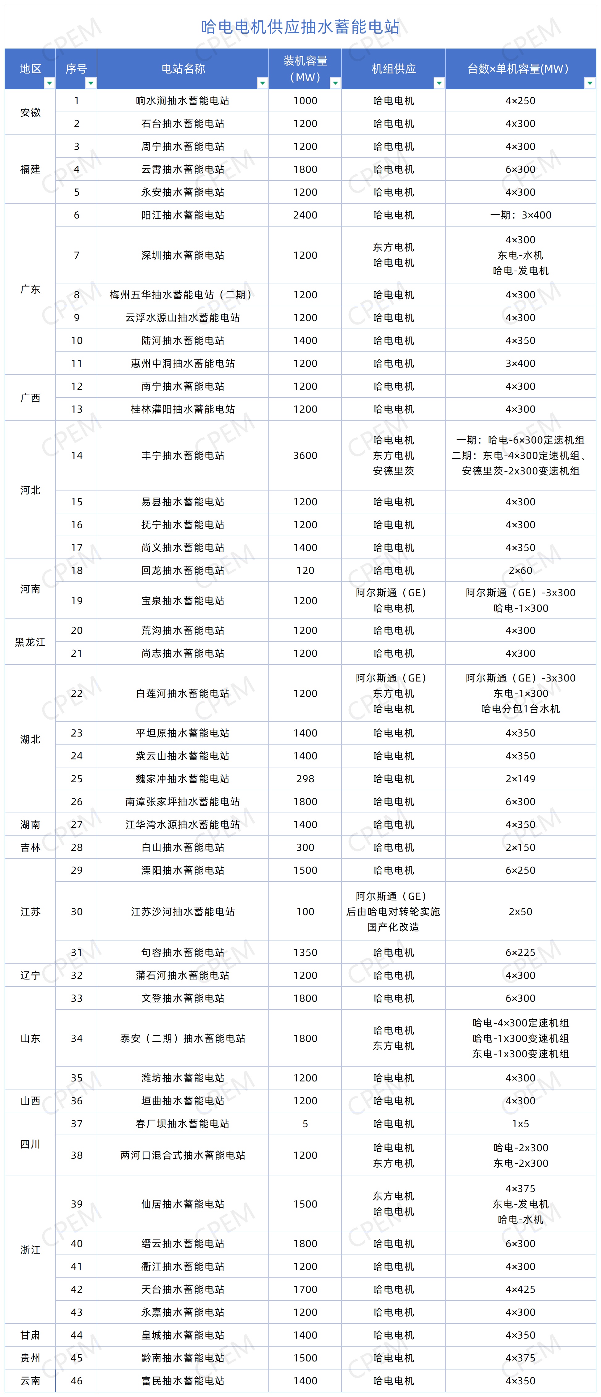 據CPEM不完全統計,東方電機供應的抽水蓄能電站如下: