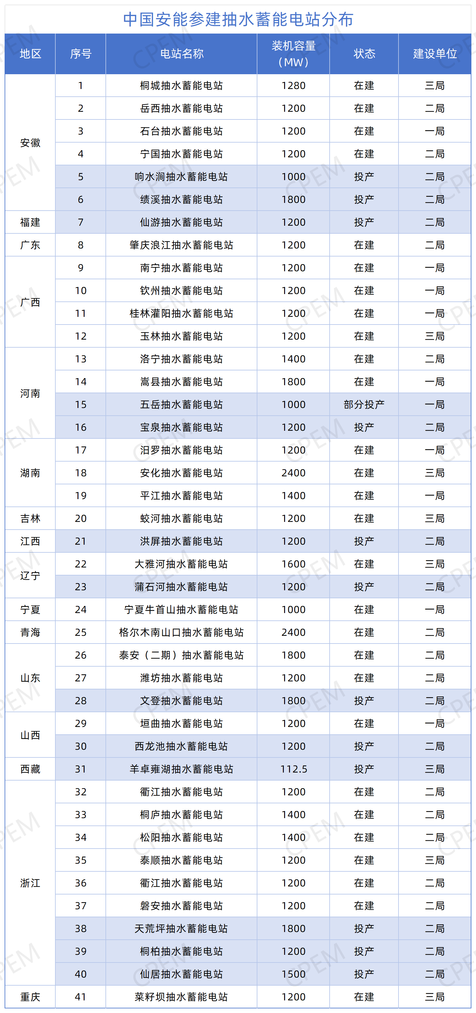 CPEM統計了中國安能參建的41座抽水蓄能電站,包括已投產/部分投產抽水蓄能電站13座,在建抽水蓄能電站28座,總裝機容量54.5GW,如下: