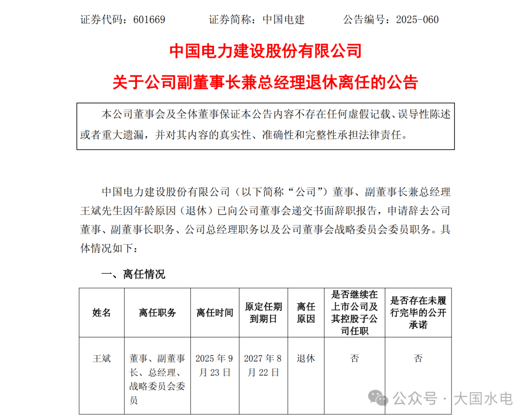 9月24日,中國電建公告稱,中國電力建設股份有限公司(以下簡稱“公司”)董事、副董事長兼總經理王斌先生因年齡原因(退休)已向公司董事會遞交書面辭職報告,申請辭去公司董事、副董事長職務、公司總經理職務以及公司董事會戰略委員會委員職務。