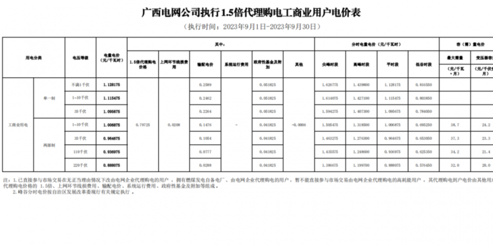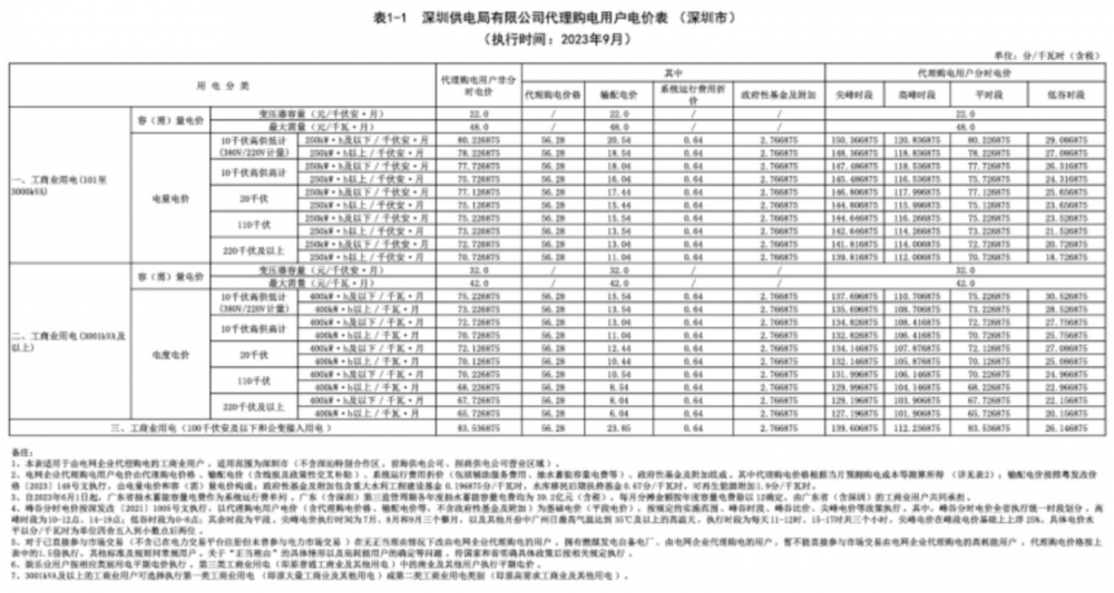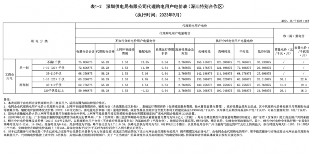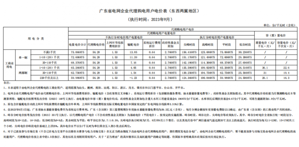 近日,2023年9月全國(guó)電網(wǎng)企業(yè)代理購(gòu)電價(jià)格陸續(xù)發(fā)布。其中,廣東市(珠三角五市)單一制尖谷電價(jià)差達(dá)到了1.4109元/kwh,上海市大工業(yè)兩部制1.5倍電價(jià)達(dá)到了1.3632元/kwh。12地方代理購(gòu)電峰谷價(jià)差超過(guò)1元。其中廣東已公布代理購(gòu)電價(jià)差均超過(guò)1元/kwh。