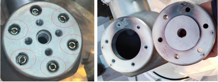 解體后發(fā)現(xiàn)過熱部位導(dǎo)體對接面局部燒蝕、熏黑,測試接觸電阻為447.8μΩ,嚴(yán)重超標(biāo)。6顆螺栓校驗(yàn)按工藝標(biāo)準(zhǔn)校驗(yàn)力矩,其中5顆螺栓緊固情況不良。