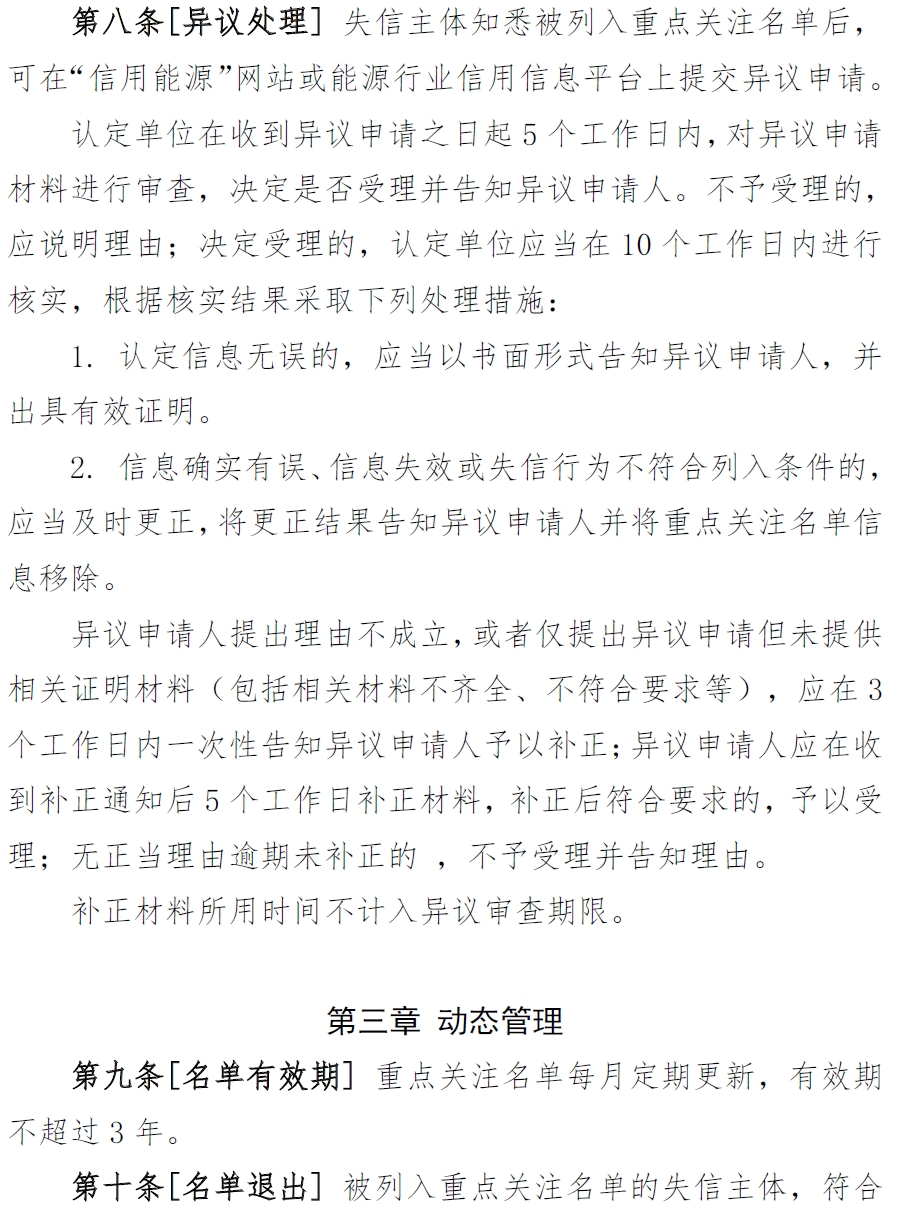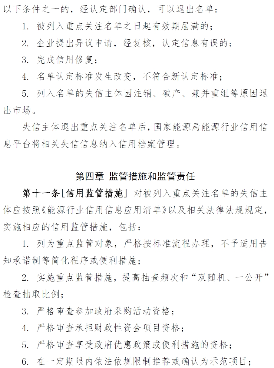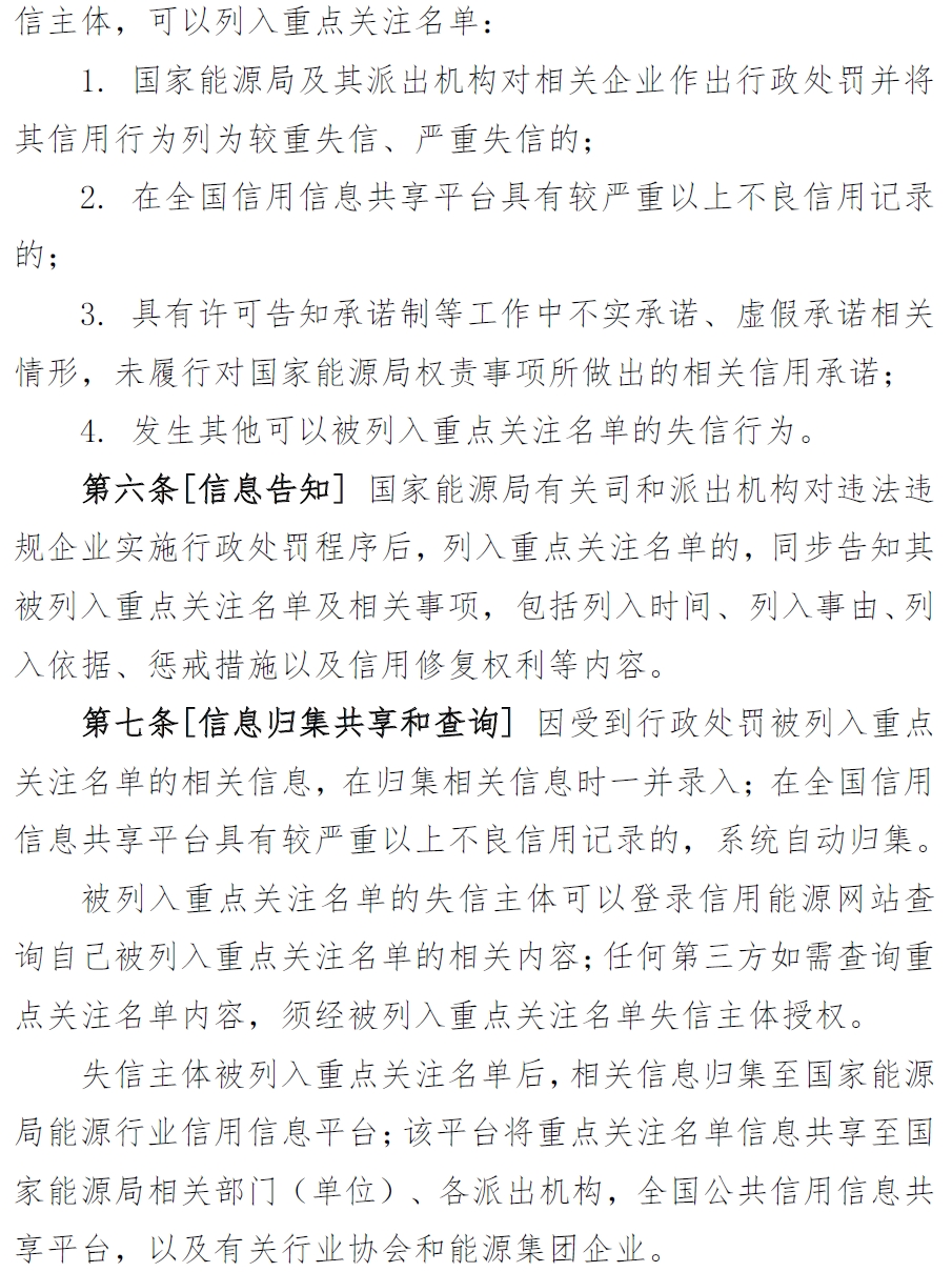 10月18日,國家能源局網站發布國家能源局綜合司關于公開征求《能源行業失信主體重點關注名單管理辦法(征求意見稿)》意見的通知。《征求意見稿》指出,本辦法所稱能源行業失信主體重點關注名單(以下簡稱重點關注名單),是指國家能源局及其派出機構依職權對接受行政處罰后信用行為被列為較重失信、嚴重失信的,存在未履行信用承諾等情形的,以及在全國信用信息共享平臺具有較嚴重以上不良信用記錄的相關企業納入重點關注名單進行管理。