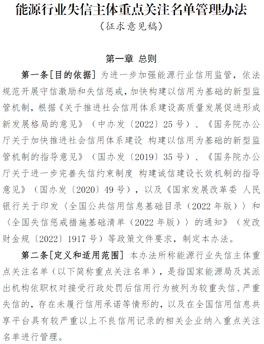 為貫徹落實黨中央、國務院關于社會信用體系建設高質量發展的決策部署,進一步推動實施守信激勵和失信懲戒,強化分級分類信用監管,國家能源局編制了《能源行業失信主體重點關注名單管理辦法(征求意見稿)》,現向社會公開征求意見。
