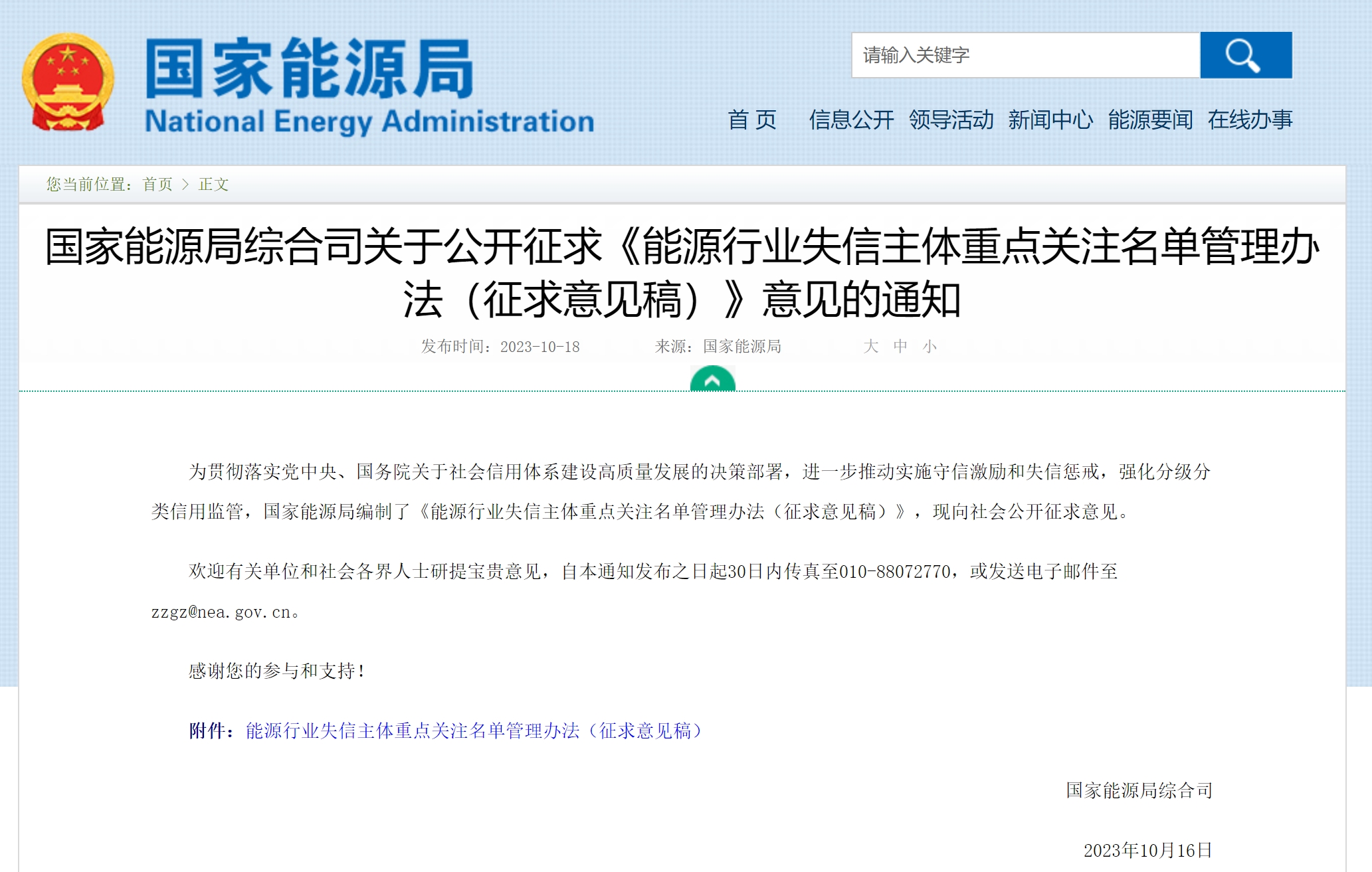 國家能源局綜合司關于公開征求《能源行業失信主體重點關注名單管理辦法(征求意見稿)》意見的通知