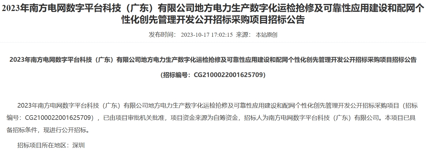 (一)項目名稱:2023年南方電網數字平臺科技(廣東)有限公司地方電力生產數字化運檢搶修及可靠性應用建設和配網個性化創先管理開發公開招標采購項目