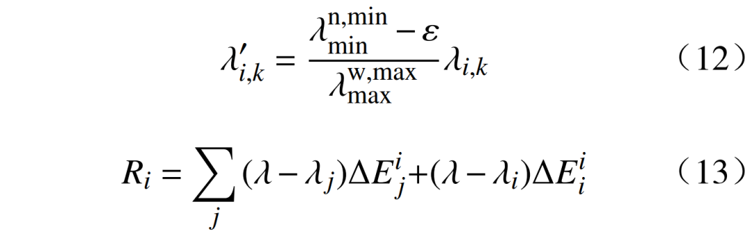 為報價最高的棄水機組的最后一段報價;ε為一個較小的正數,用于報價調整,可由電力交易中心綜合考慮后決定;Ri為水電機組i的調蓄價值,用于描述梯級上游發電量通過影響下游發電能力為系統帶來的價值;j為電站i的下游電站;λ為邊際出清電價;為下游電站因電站i的調蓄作用增加的中標電量;式(13)右端第1項表示上游電站增發