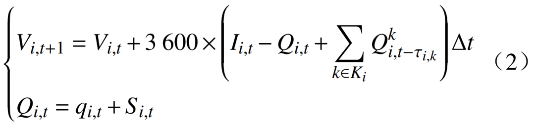 式中:Vi,t+1和Vi,t分別為機組i在t+1時段和t時段的庫容;Ii,t為機組i在t時段區間的入庫流量;Qi,t為機組i在t時段的出庫流量;為機組i在第k個上游電站在t?τi,k時段的出庫流量;Ki為電站i的上游電站集合;τi,k為機組i到上游電站k的水流時滯;qi,t為機組i在時段t的發電流量;Si,t為機組i在t時段的棄水流量。