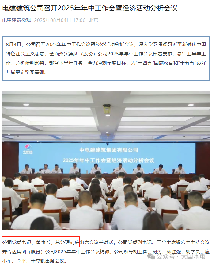 2025年7月14日,中國電建召開電建建筑公司干部大會,宣布電建建筑公司主要負責人任職決定:
