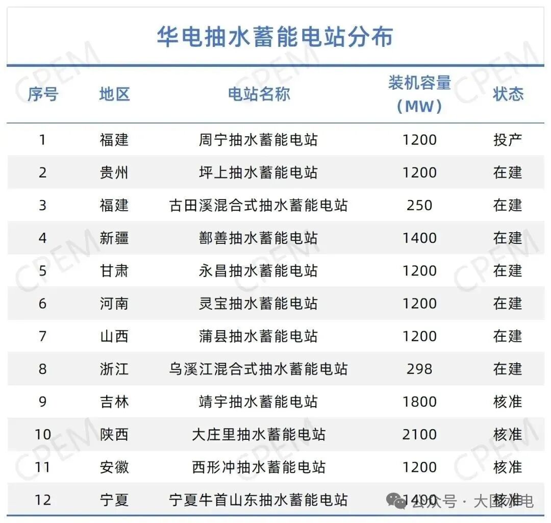 據CPEM大國水電統計,截至2025年6月,華電在運及在建/核準抽水蓄能電站12座,總裝機容量約14.45GW。