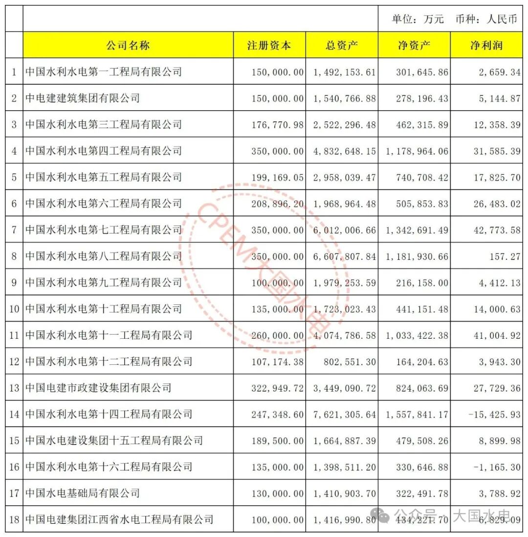 中國電建旗下18家工程局(水電與抽水蓄能相關):