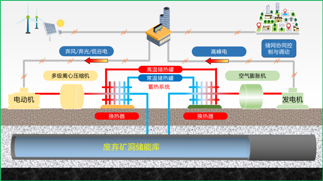 儲能環節:壓縮空氣儲能系統在用電低谷或電力過剩時,利用風電/光電或電網負荷低谷期的電能帶動壓縮機,將電能轉化為空氣壓力能,隨后高壓空氣被密封存儲于報廢礦井(電能→勢能);