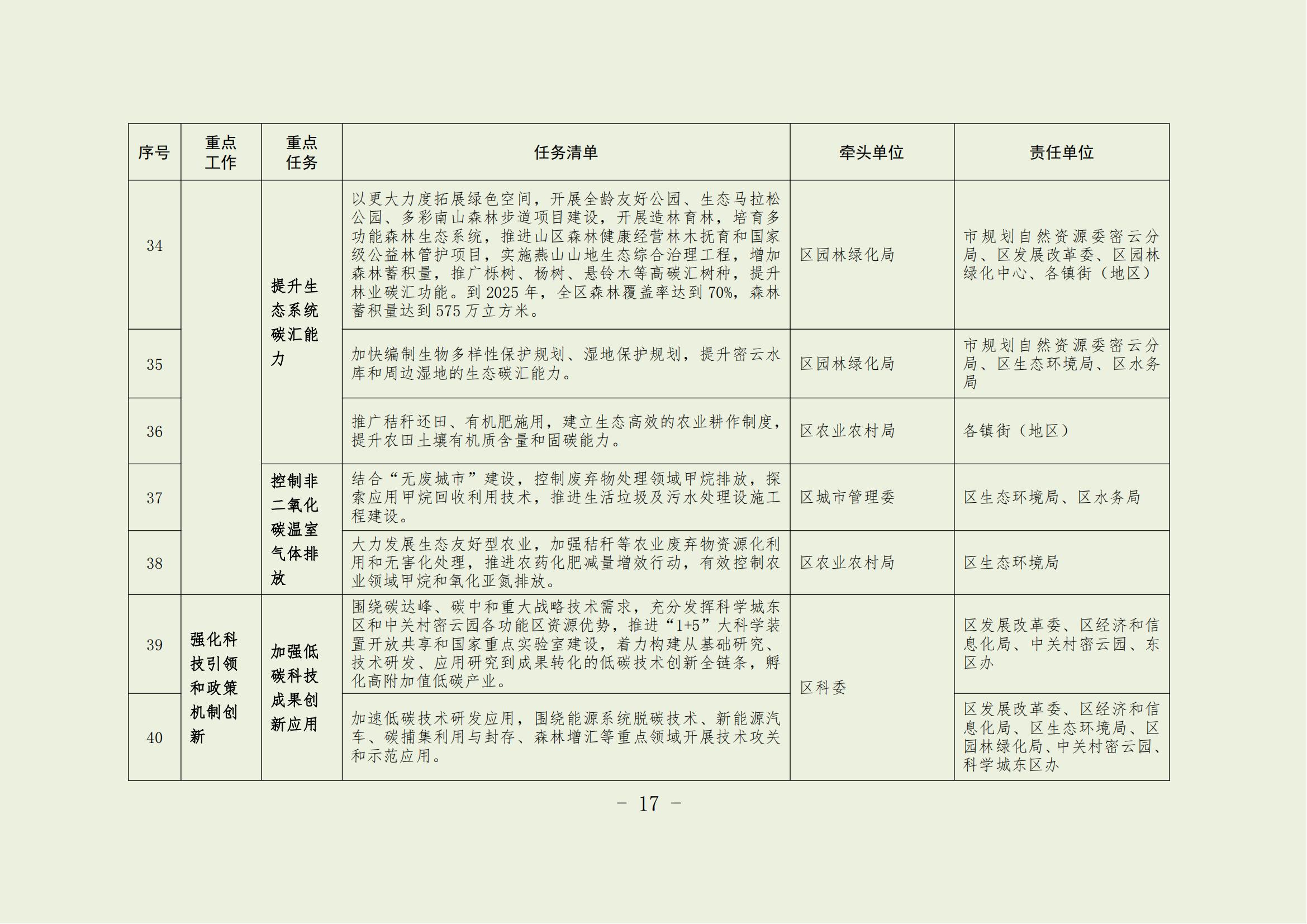 15.提升統計、計量和監測能力。配合市級部門建立并落實全市碳排放統計核算體系,建立健全建筑、可再生能源等重點領域能耗和碳排放計量、監測和統計體系。開展區級溫室氣體排放清單編制工作。配合市級部門開展森林、草地、濕地、土壤等生態系統碳匯本底調查和碳儲量評估。探索非二氧化碳溫室氣體監測統計。