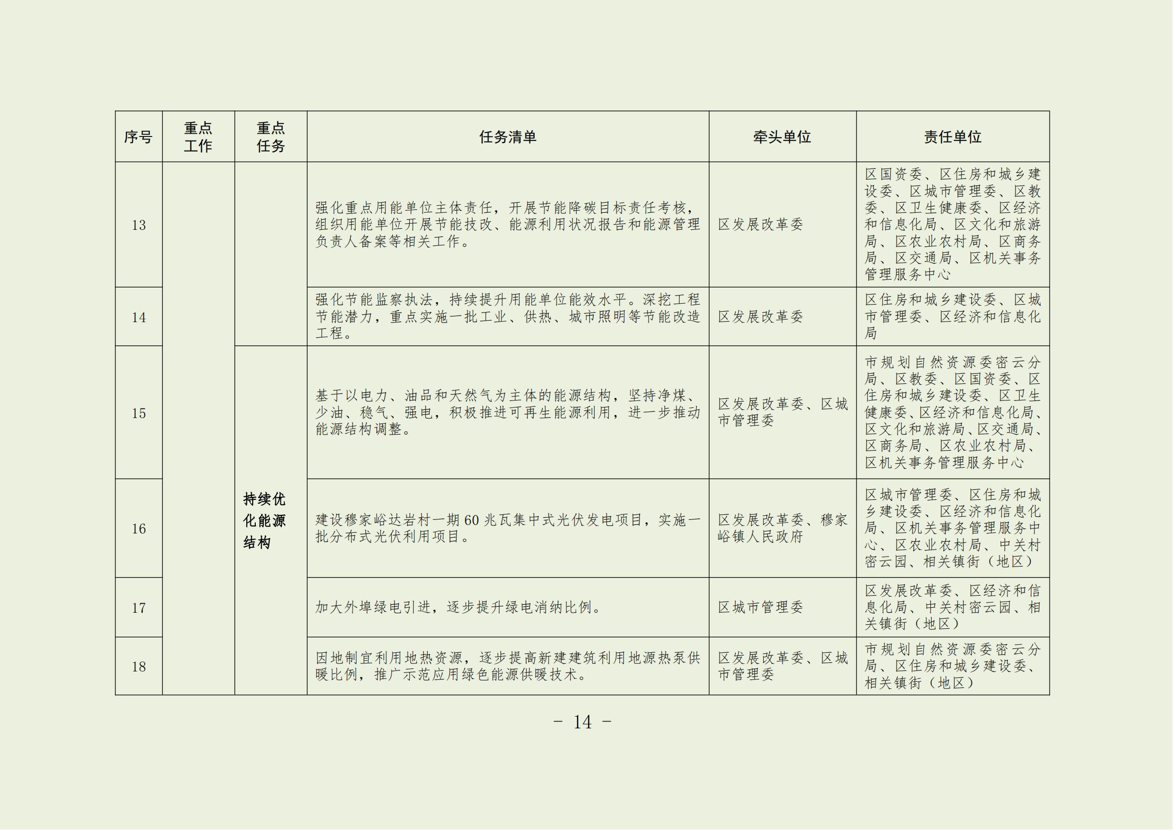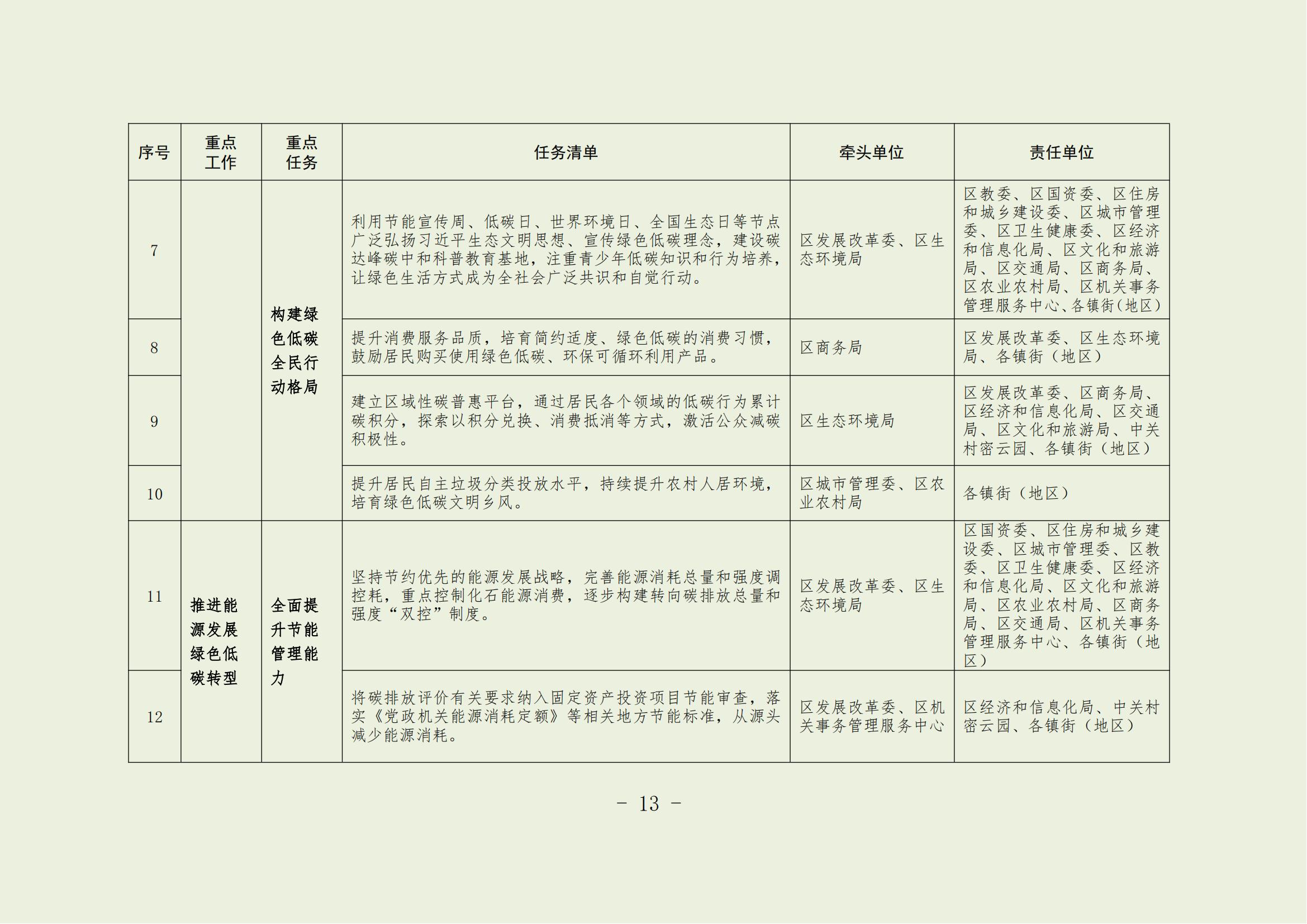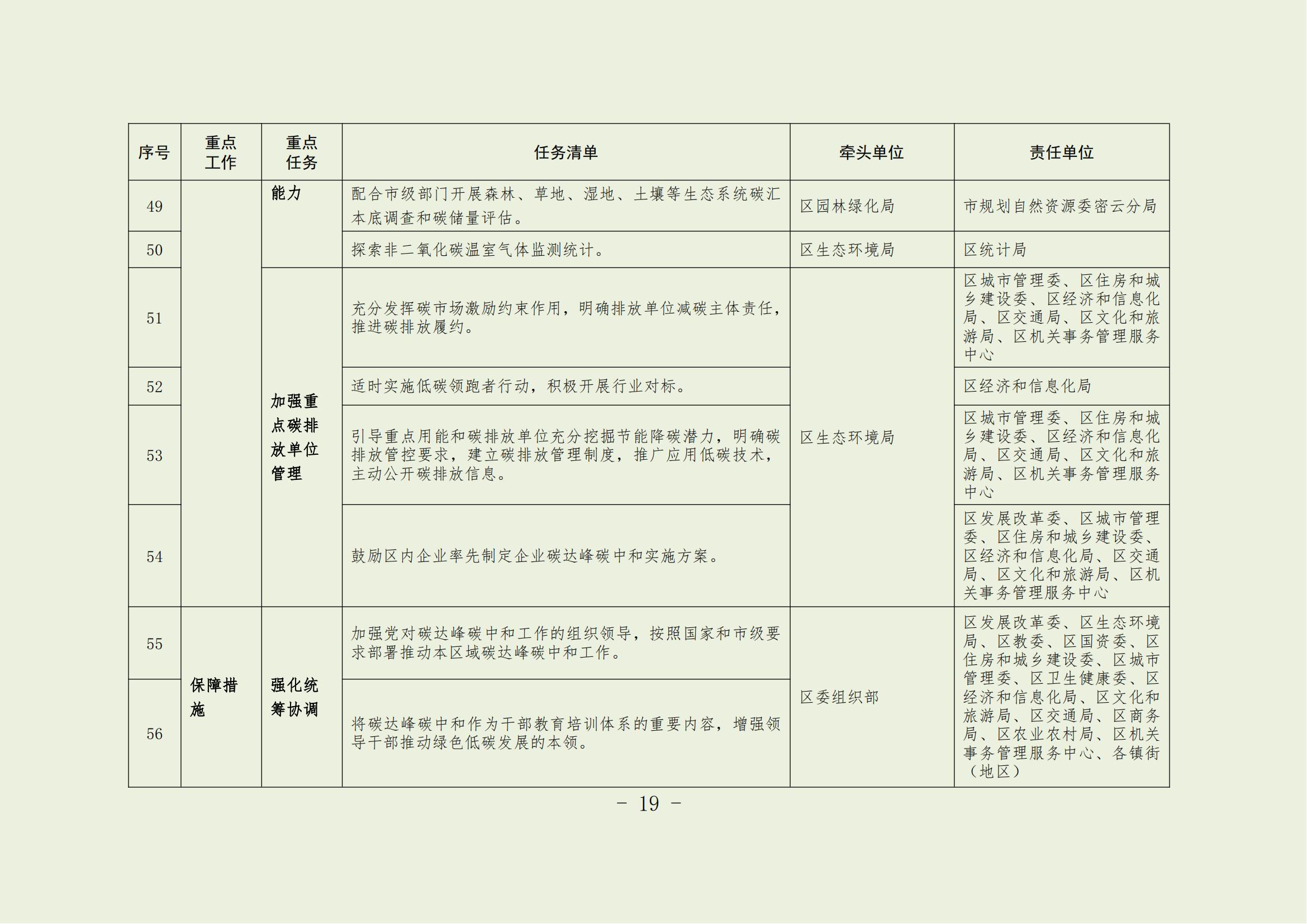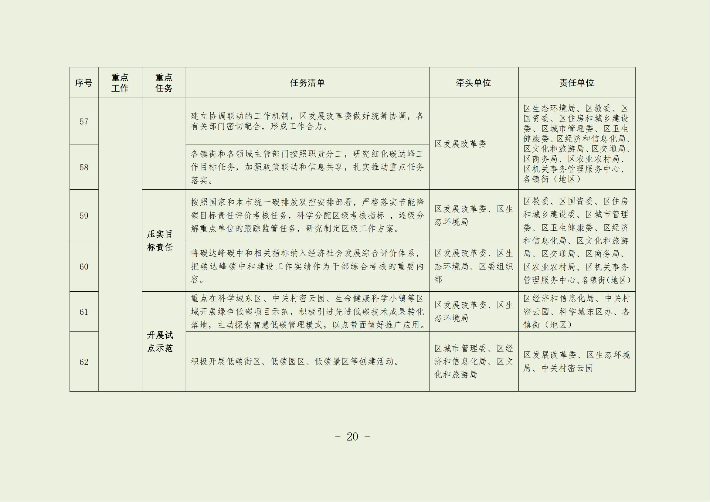 18.壓實目標責任。按照國家和本市碳排放雙控安排部署,嚴格落實節能降碳目標責任評價考核任務,科學分配區級考核指標,逐級分解重點單位的跟蹤監管任務,研究制定區級工作方案。將碳達峰碳中和相關指標納入經濟社會發展綜合評價體系,把碳達峰碳中和建設工作實績作為干部綜合考核的重要內容。