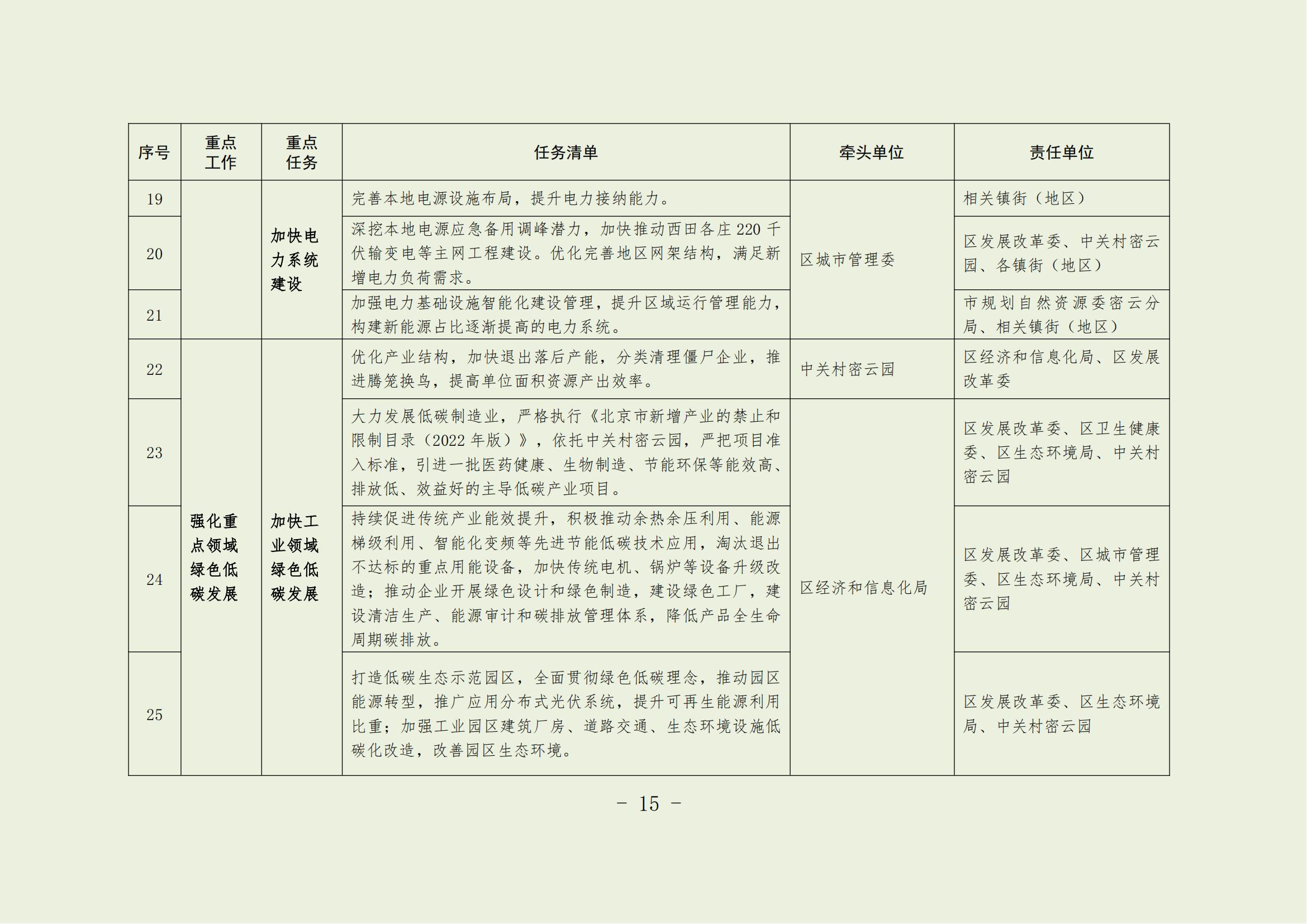 7.加快工業領域綠色低碳發展。工業領域要持續推動提質增效,加快發展新質生產力,實現綠色低碳轉型。優化產業結構,加快退出落后產能,分類清理僵尸企業,推進騰籠換鳥,提高單位面積資源產出效率。大力發展低碳制造業,嚴格執行《北京市新增產業的禁止和限制目錄(2022年版)》,依托中關村密云園,嚴把項目準入標準,引進一批醫藥健康、生物制造、節能環保等能效高、排放低、效益好的主導低碳產業項目。持續促進傳統產業能效提升,積極推動余熱余壓利用、能源梯級利用、智能化變頻等先進節能低碳技術應用,淘汰退出不達標的重點用能設備,加快傳統電機、鍋爐等設備升級改造;推動企業開展綠色設計和綠色制造,建設綠色工廠,建設清潔生產、能源審計和碳排放管理體系,降低產品全生命周期碳排放。打造低碳生態示范園區,全面貫徹綠色低碳理念,推動園區能源轉型,推廣應用分布式光伏系統,提升可再生能源利用比重;加強工業園區建筑廠房、道路交通、生態環境設施低碳化改造,改善園區生態環境。