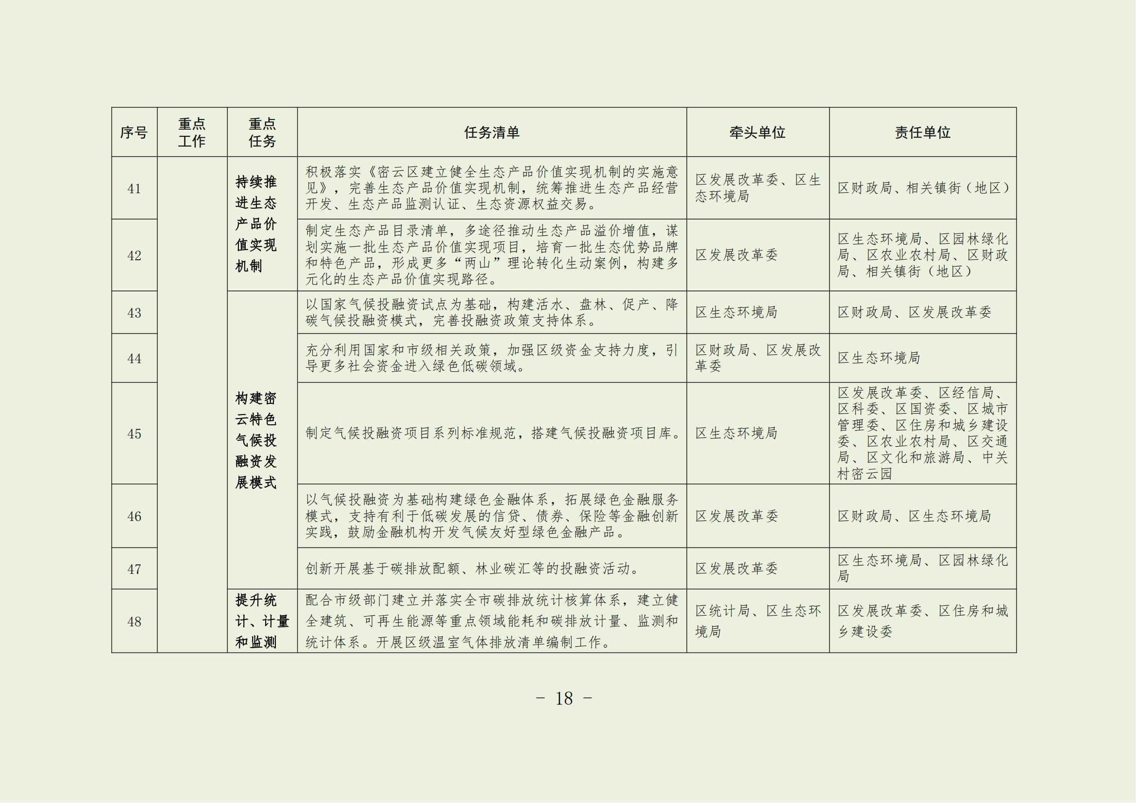 17.強化統籌協調。加強黨對碳達峰碳中和工作的組織領導,按照國家和市級要求部署推動本區域碳達峰碳中和工作。建立協調聯動的工作機制,區發展改革委做好統籌協調,各有關部門密切配合,形成工作合力。各鎮街和各領域主管部門按照職責分工,研究細化碳達峰工作目標任務,加強政策聯動和信息共享,扎實推動重點任務落實。將碳達峰碳中和作為干部教育培訓體系的重要內容,增強領導干部推動綠色低碳發展的本領。